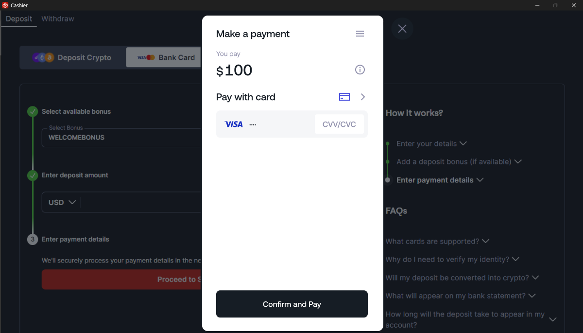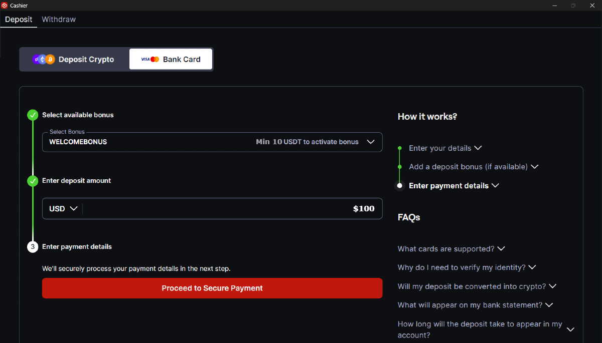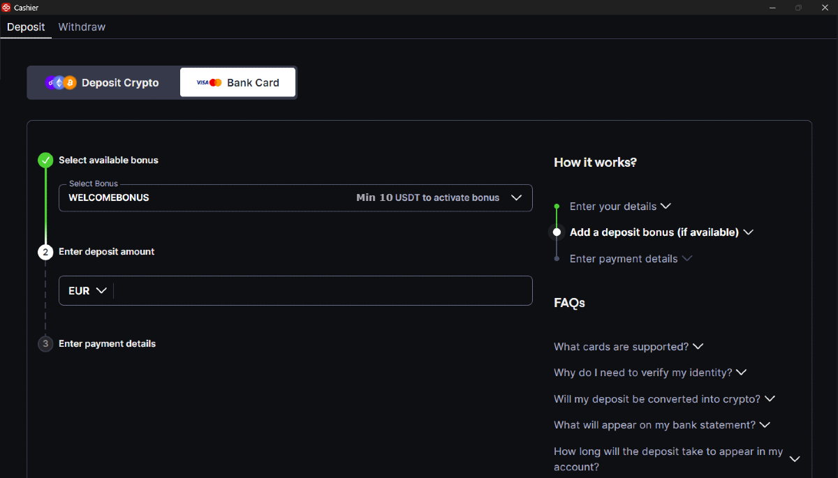 Abbiamo reso ancora più semplice effettuare un deposito su CoinPoker. Ora può effettuare un deposito direttamente con una carta di credito in pochi semplici passaggi, senza bisogno di criptovalute! Segui i passaggi indicati di seguito per effettuare un deposito su CoinPoker con una carta di debito o di credito.