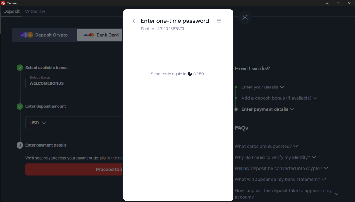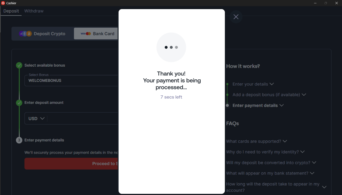 È tutto! Se la transazione è andata a buon fine, i tuoi fondi saranno disponibili sul tuo conto in 24 ore. Se hai domande sul tuo deposito, contatta il nostro team di assistenza.