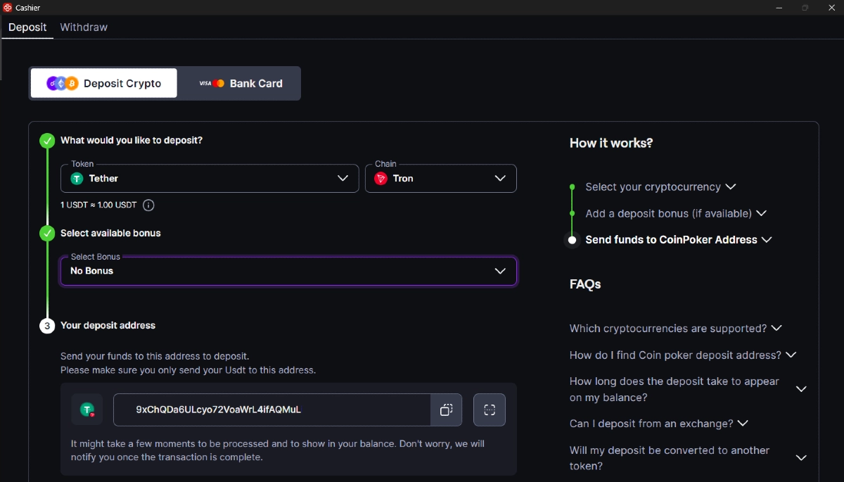 È possibile effettuare depositi da wallet crypto personali o da exchange, direttamente sul tuo account CoinPoker. Il processo è semplice, veloce e CoinPoker non addebita assolutamente alcuna commissione per il deposito. Se desideri effettuare un deposito con carta di credito utilizzando valuta fiat, seleziona la scheda “Come effettuare un deposito con carta di credito” dal menu sopra.