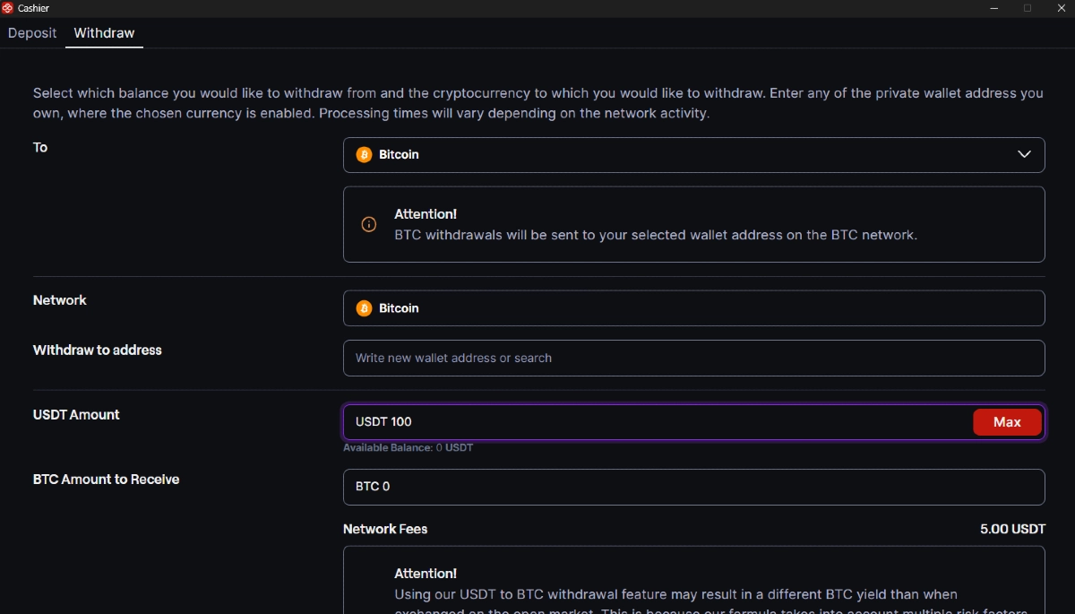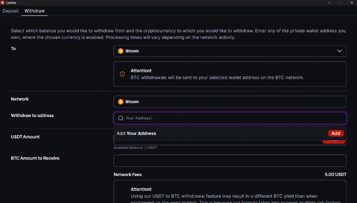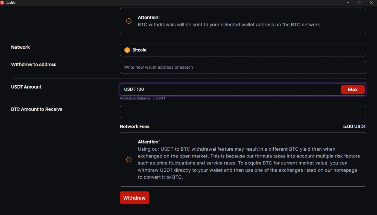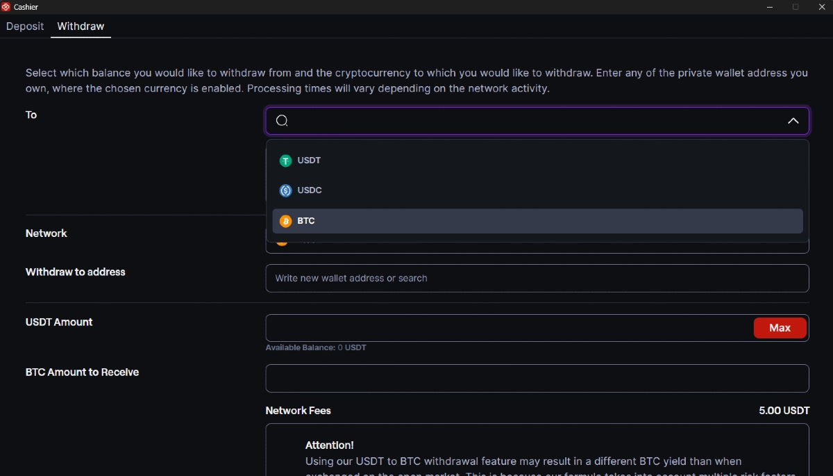 - Commissione da USDT a BTC = Circa 1 USDT ( consigliamo di controllare il Cassiere nell’app CoinPoker per la commissione BTC aggiornata)