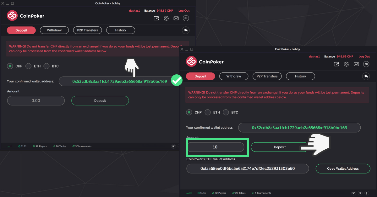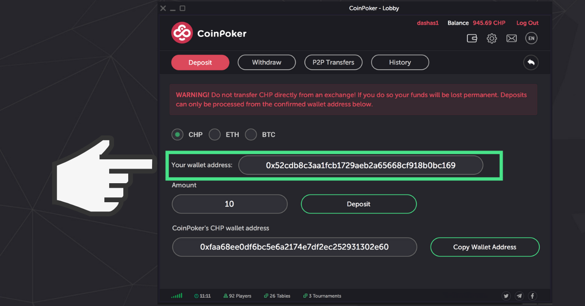 Note that if you do not hold CHP tokens and prefer using more common cryptocurrencies, you can also deposit to CoinPoker in BTC or ETH. Below is a link that will show you how to do that: